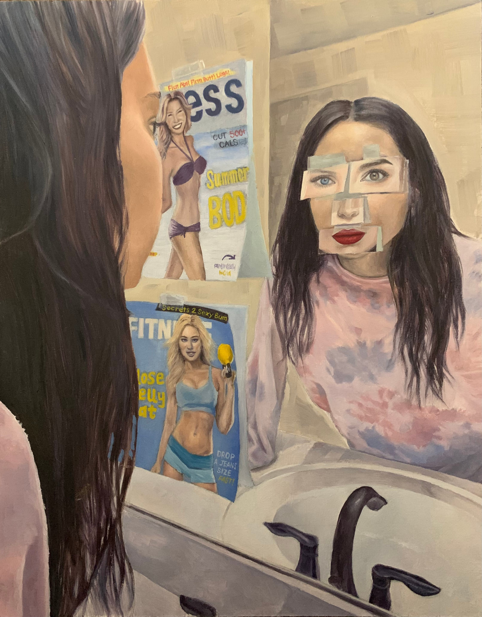 The purpose of my artwork is to convey the struggle many people, especially young girls and women, face in trying to find their identity in a world full of influence from social media. With the rising prevalence and normalization of plastic surgery and photo editing among celebrity figures, beauty standards have become increasingly harsh. This is seen especially in many magazines which tend to all have similar headlines that promote sexism and pressure women to look or behave a certain way in order to be deemed “worthy.”