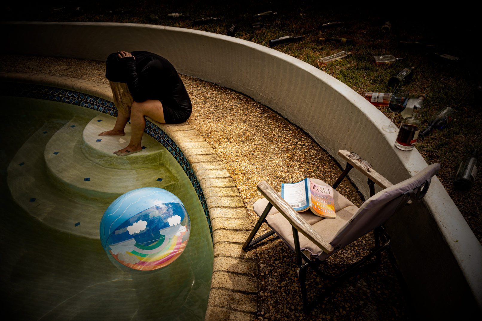 A lot of people suffer in silence, confronted by the many stressors are fast paced life. In this representation of drowning, their are hazards on both sides of the path. To the left a literal sense of drowning in water. To the right, drowning by addiction. But to walk the center, you can find the answer. Problems that we have seem overwhelming at times, but by taking a seat, putting on glasses to focus, and concentrating on the lessons of others, you can walk the path and not fall into the water or fall up to addiction.