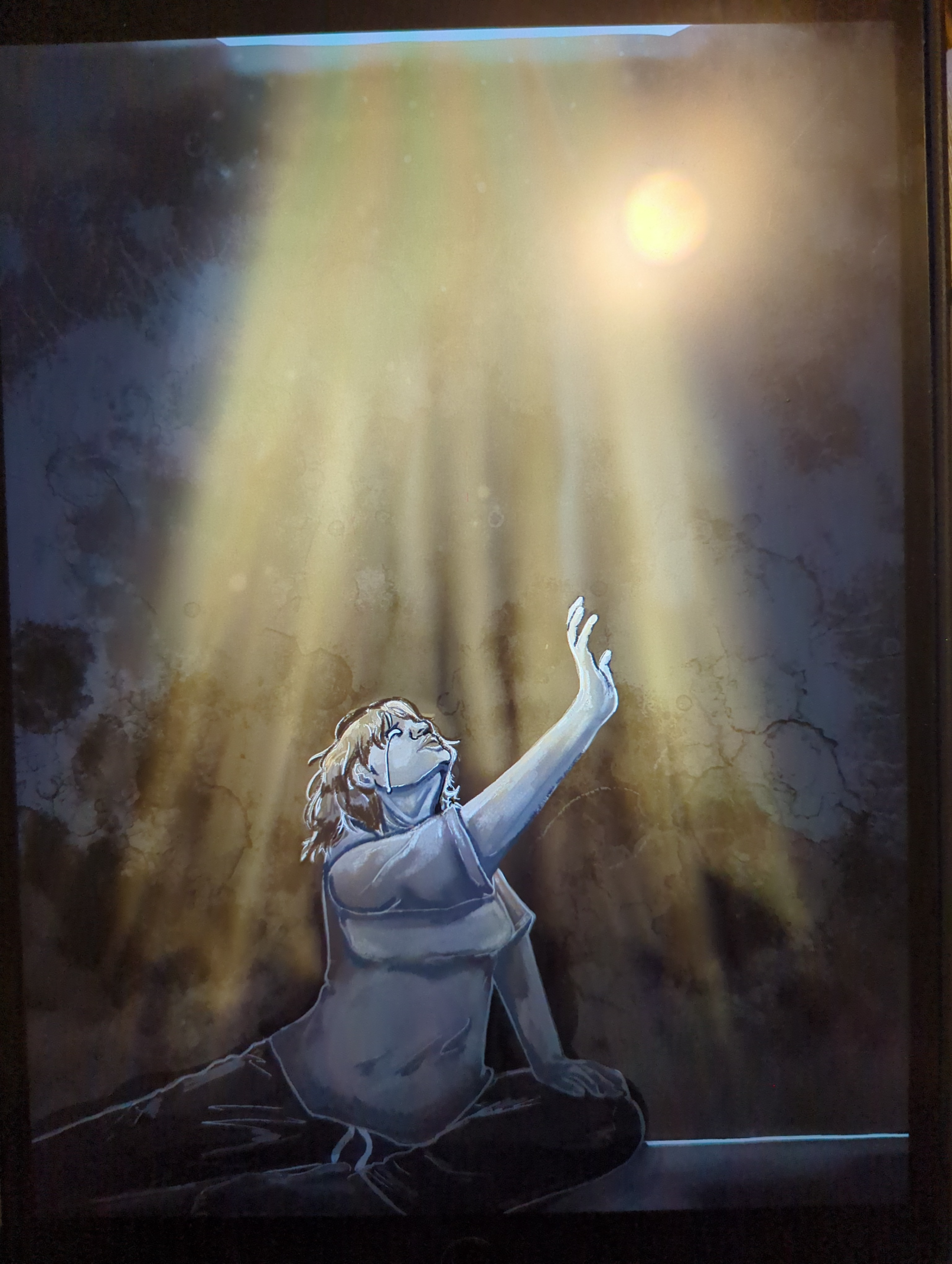 This piece represents relapse in mental health. I struggled a lot with juggling between feeling better and then falling back down into this pit. So the art is ment to represent how it feels to sink to the bottom desperately reaching for where you once were. I hope that other people can relate and find comfort they are not alone in this feeling.