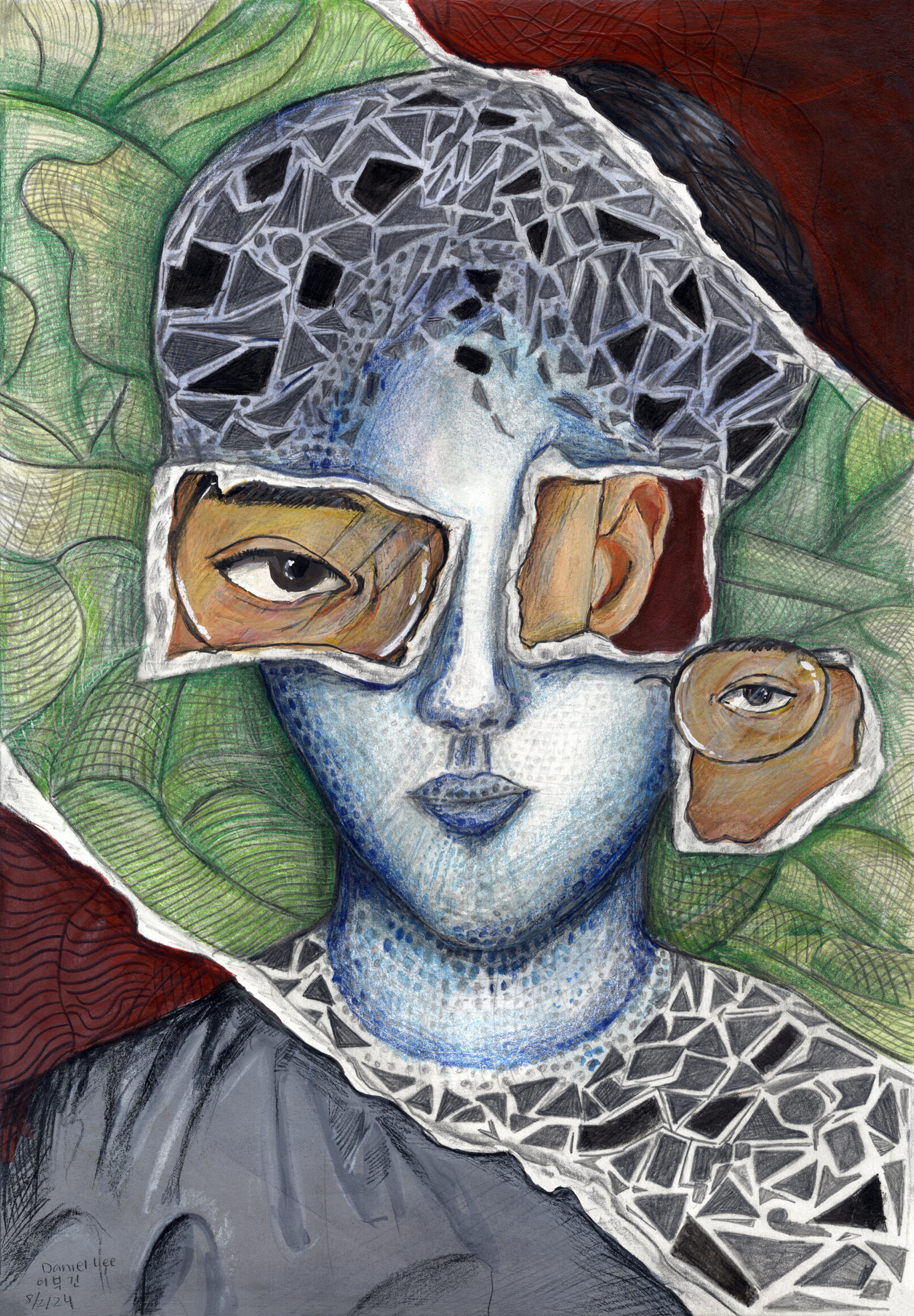 “Pieces” show the broken and complicated side of identity by mixing realism and abstract art. The background has green lines that twist and turn, creating sections covered with a light watercolor wash. Some parts of the image look torn, showing the layer of dark red underneath. Features like an enlarged eye and a shifted ear seem out of place, highlighting feelings of disconnection. The mix of sharp geometric shapes and realistic details reflects the struggle between control and chaos in how we see ourselves.