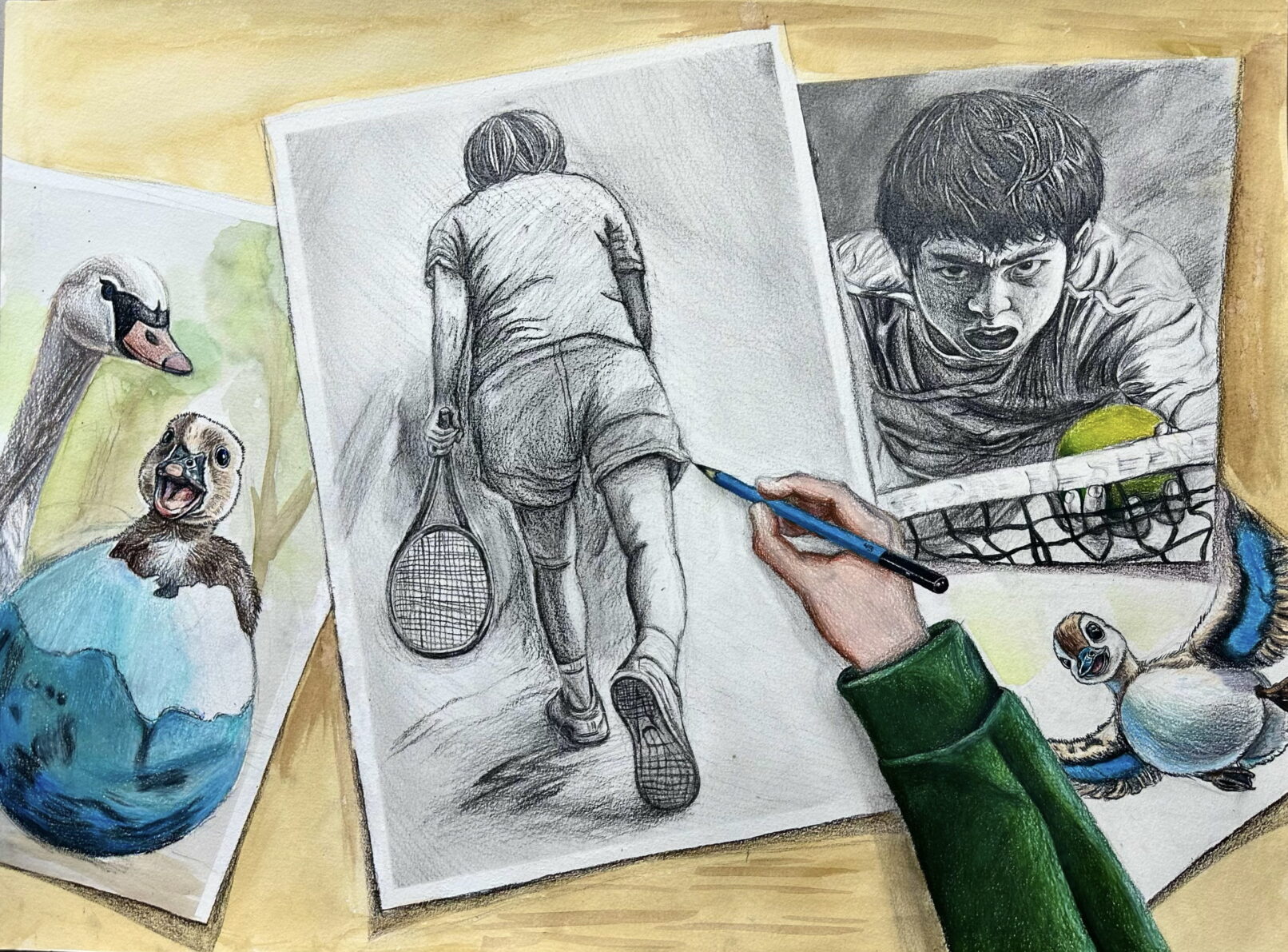 No one is born perfect; imperfection is the essence of life. A newly hatched gosling bears little resemblance to its graceful mother, and someone like me can easily feel frustrated by their terrible tennis skills. Yet, it is from these imperfections that motivation and strength arise. With determination and perseverance, I could become unstoppable on the court one day, just as the gosling will eventually take its first flight. These moments and impressions vividly capture the images in my mind, which I chose to express as collages in my artwork.