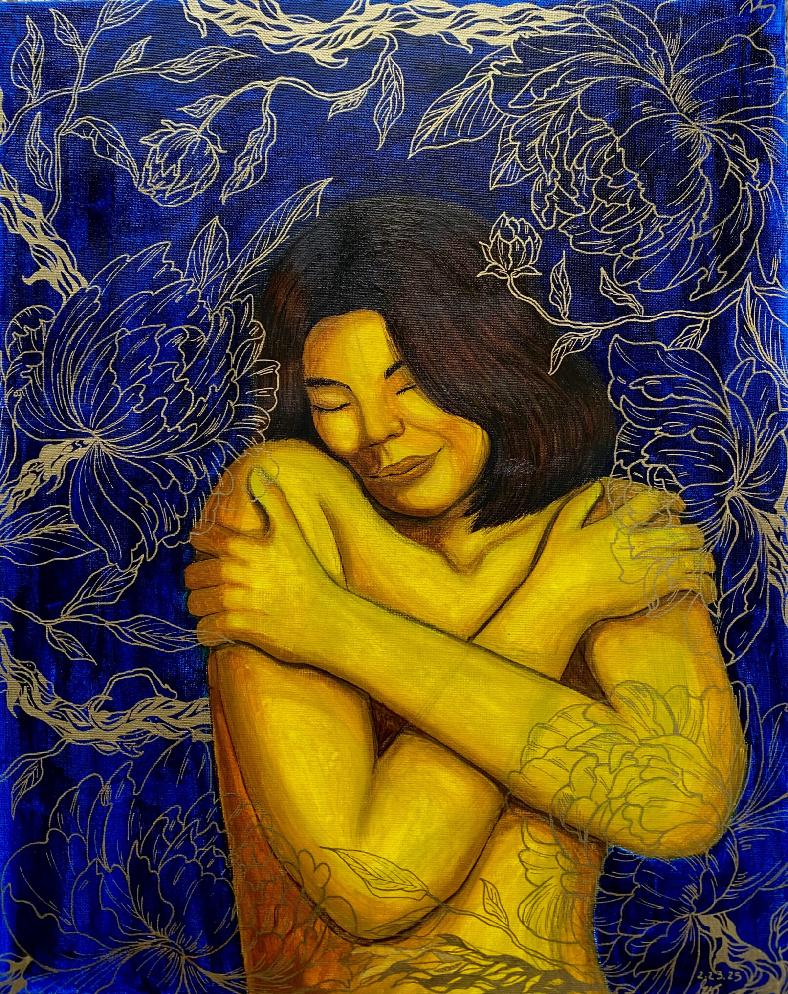 "Mental health" and "wellbeing", to me, are the results of "self-love". In order to be mentally healthy, the best method is to love the present, love what I have, love who I am, who I was, and who I will be. Loving myself makes me feel like I am the most beautiful flower in the garden. I have been fascinated by the complexities of human anatomy ever since I started the journey of art, and it is the reason why I chose to explore the meaning of self-love through the combination of portraits and the flowery background. I worked with a variety of materials, utilizing watercolor and metallic paint, allowing each medium to contribute to the final composition. The process of creating this piece was my journey of exploration and discovery as I stepped out of my comfort zone and created a work that used stronger brushstrokes and stronger colors.