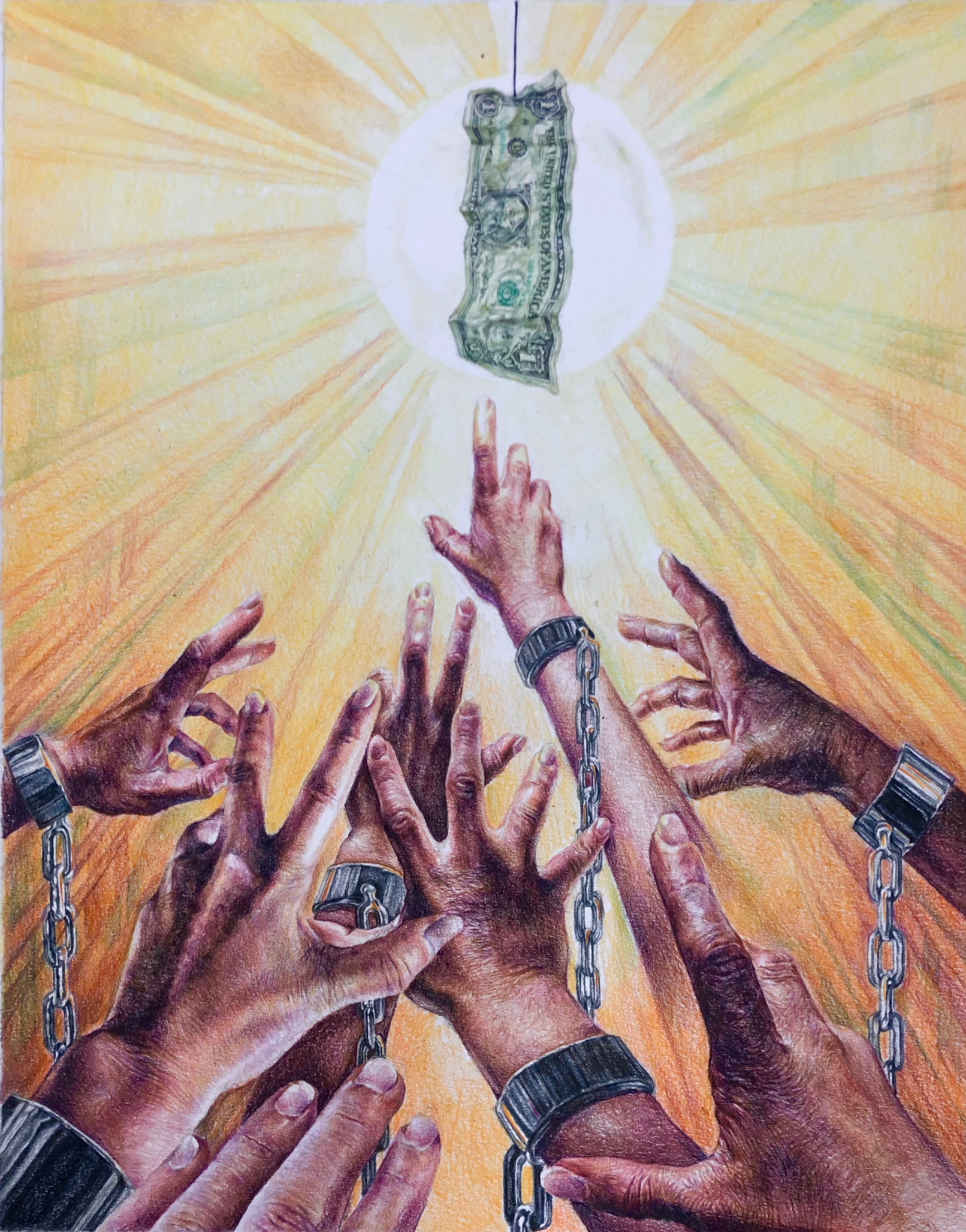 For this piece, I was inspired by the way money controls many of our lives. In modern society, many struggle from hopelessness, despair, and anxiety. The root of these problems are often due to the seemingly endless pursuit of money. Yet, there always seems to be a shortage of it, with minimum wage jobs so low and healthcare, food, rent, and utility costs so high. In the end, it seems as if we are always reaching for more, leading to an unshakeable sense of hopelessness. I hope the viewers will be able to understand this feeling through my art and identify with it. I chose colored pencil for this piece because it is my strongest medium, so I thought it would be best to convey my message. For my background, I based it off of traditional paintings of Jesus, where he is surrounded by a bright halo. I hope that this effect shows the overemphasis of value of money and how it is the focus of many of our desires and struggles.