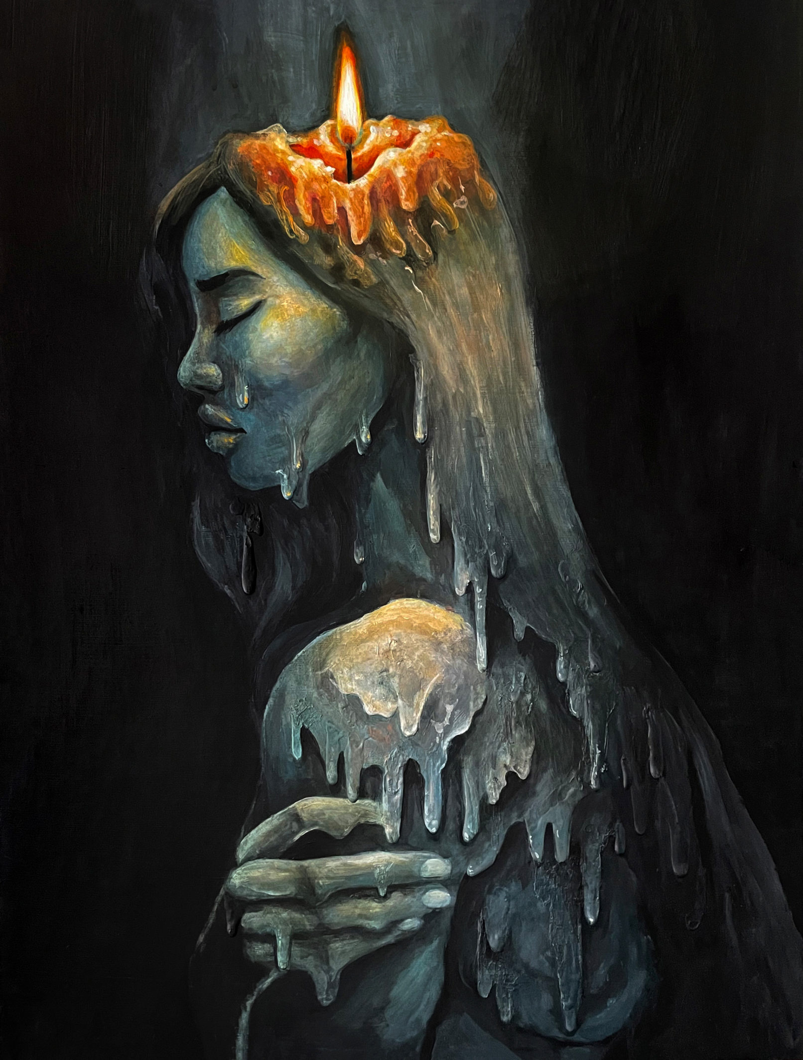 This piece resembles how one's youth can slip away in a moment, like candle wax melting. The longer the flame lives, the more damage inflicted on the physical body. If one's fire gets snuffed out, then their youth is preserved forever. But is it worth the cost?